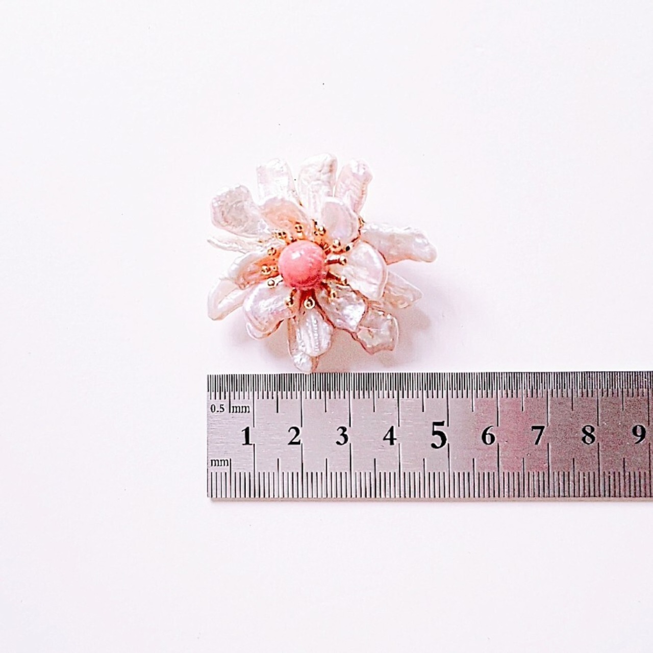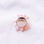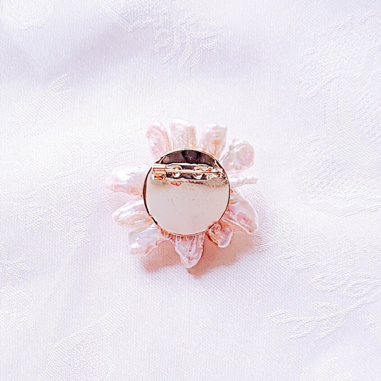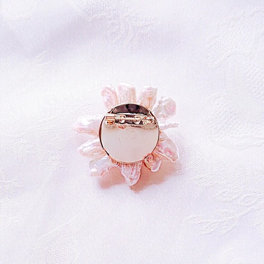 ピンクの天然石を中心に、真珠の花びらが咲き誇るブローチ